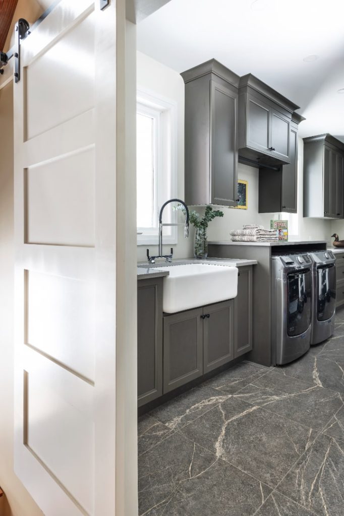 Barn doors, pocket doors, or bi-fold doors allow you to conceal the entire laundry room when not in use. This keeps sightlines clean and maintains the flow of your home.
